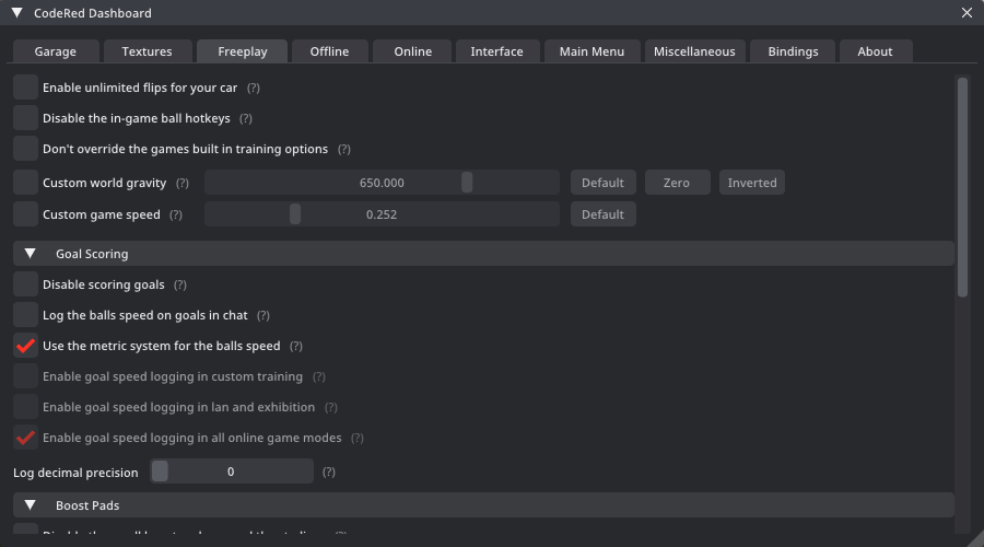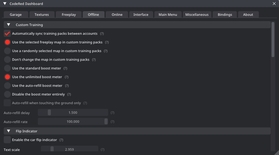 dashboardF1The dashboard is the main interface used to control CodeRed, comparable to BakkesMod's settings window, it hosts most of the settings and commands available to the user.